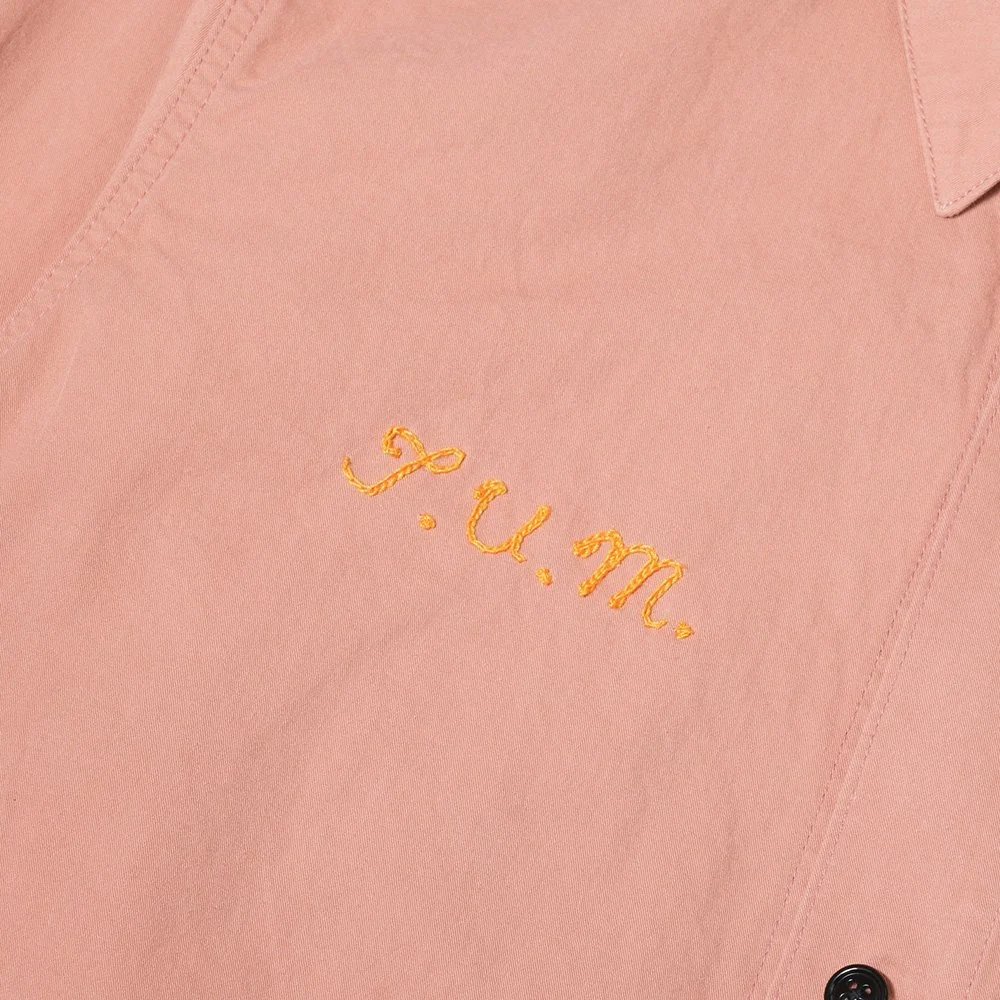 ワークジャケットとひと口に言っても、その数は無数。ディテールや丈感の違いによって、「どんな作業のために作られたジャケットなのか」を想像し、共感することもまた、ワークウェアの醍醐味です。 今回、THE BLUEST OVERALLからリリースされたのは、そんな“ワーク”の文脈をベースにした一着。薄手のコットンツイル生地を使用しており、まるでシーツのようにさらっとした肌触り。暑い日でも軽く羽織れる、まさにちょうどいい生地感です。 シルエットはややワイドながら、丈感は少し短めでバランスよく仕上げました。胸ポケットには、サングラスやメガネを引っ掛けられる仕様。右下ポケットの内側には、タバコや目薬などの小物が動かないように収められるインナーポケットを装備。使い込むほどにアタリが出て、味わい深く育っていきます。 胸元には、“T.U.M”(THE UNION MADEの略)のチェーンステッチ刺繍をオン。大阪・桜橋で“BYTEN”という店舗を構え、チェーンステッチを生業とする"SO GOOD ISLAND"のENZO氏(@sogoodisland)に依頼し、手作業で施してもらいました。 一見シンプルながら、随所にこだわりが詰まったシャツジャケット。袖を通すたびに、その魅力がじわりと伝わる逸品