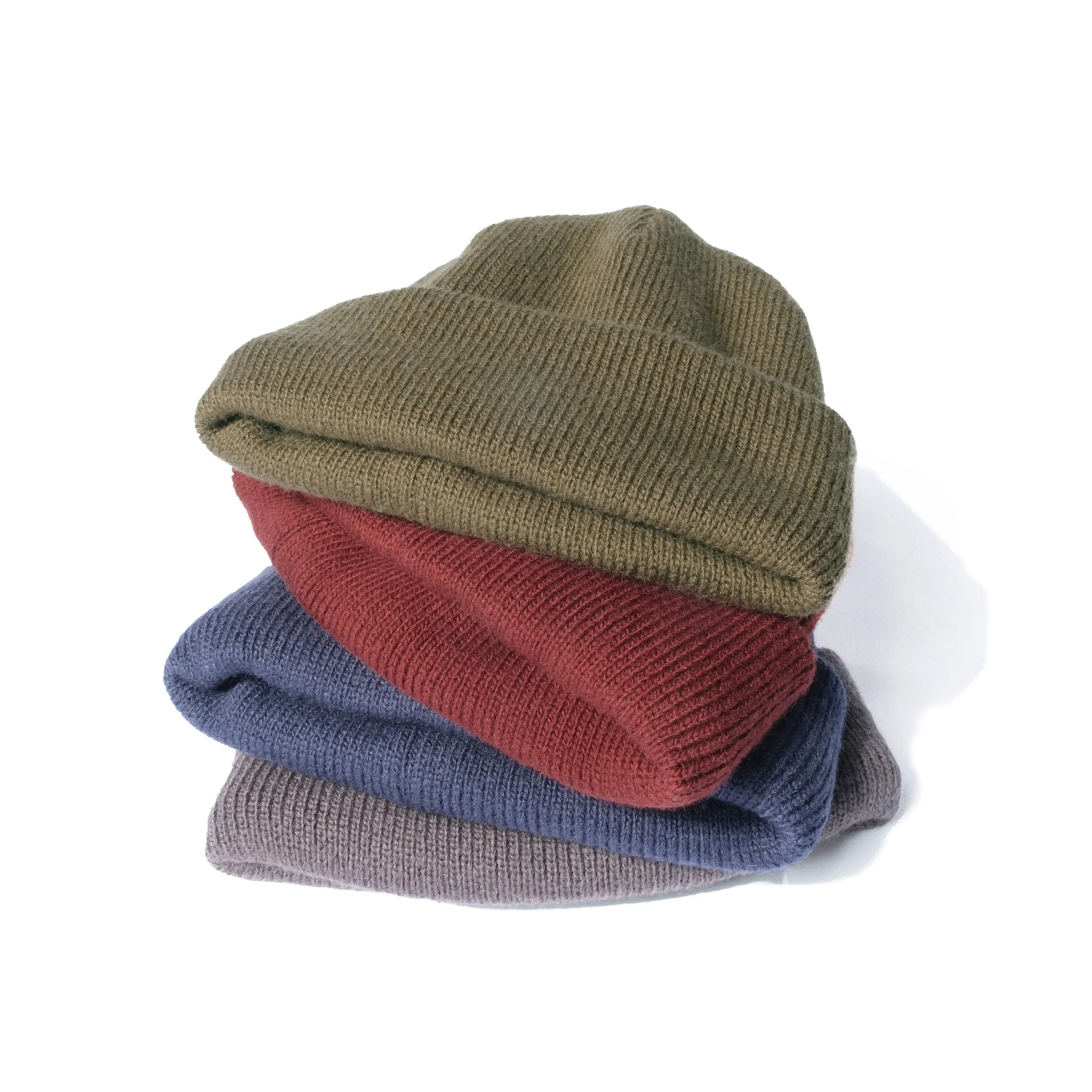 The WATCH CAP is THE COLOR's most classic item. Made with 80% acrylic, 15% nylon, and 5% wool yarn, it is more acrylic than usual and is less likely to lose its shape. The yarn used is a bit firmer than usual. The colors are subdued burgundy, gray, olive, and navy. The WATCH CAP can be worn in a variety of ways, so it can be worn depending on the scene or person, making it a versatile item that can be worn to suit any occasion.