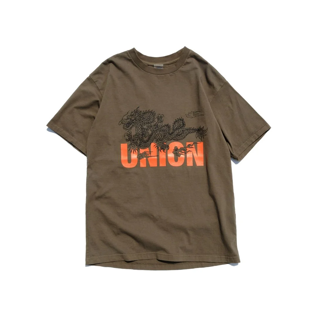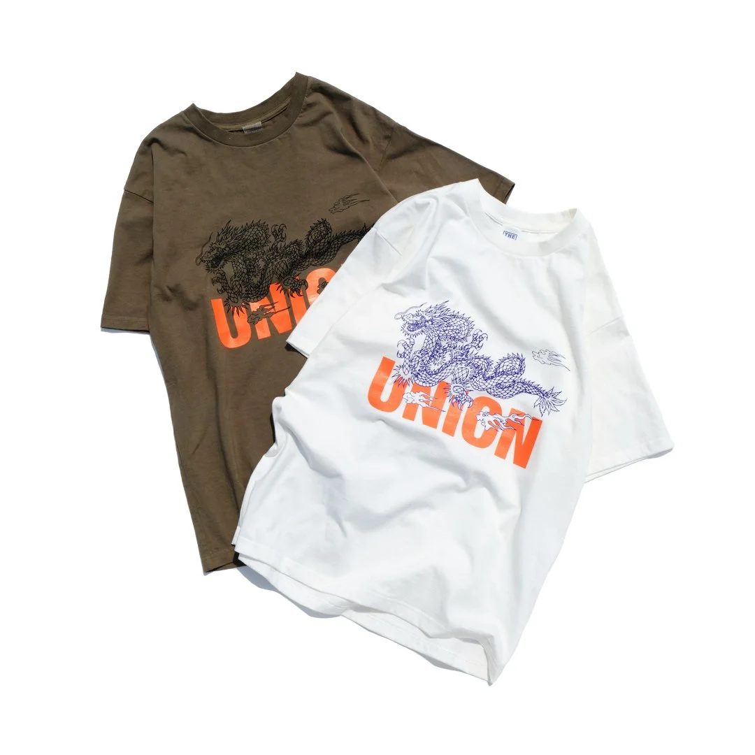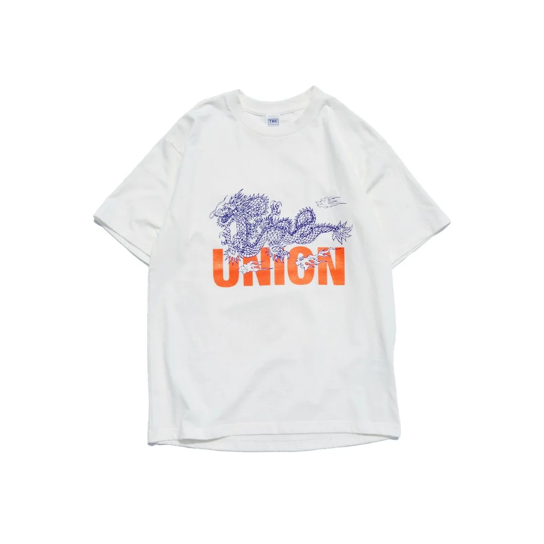 今年の干支である龍を、THE UNIONから独立したLOOKERのモックス(@y7_moxx)が龍の体で表現した"THE"を書き下ろし、その下にブロック体でUNIONの文字を置いたプリントTシャツ。