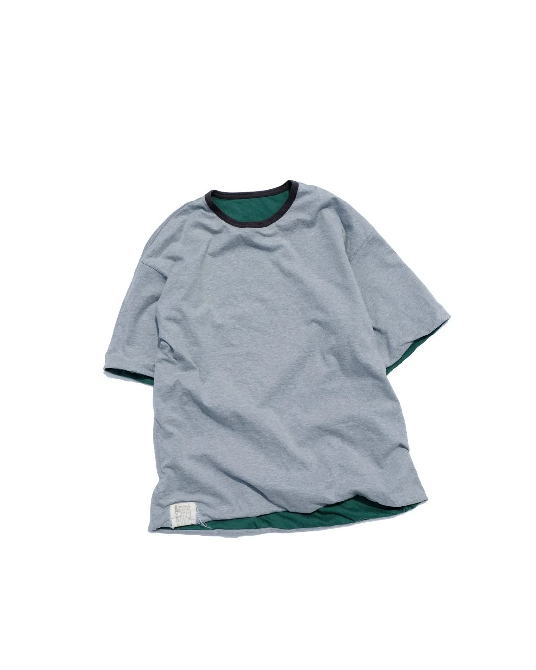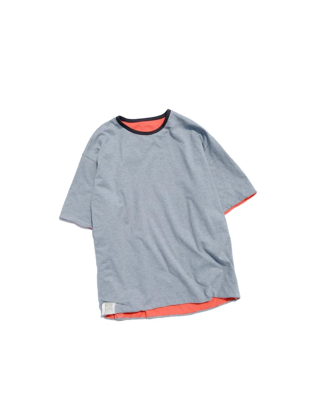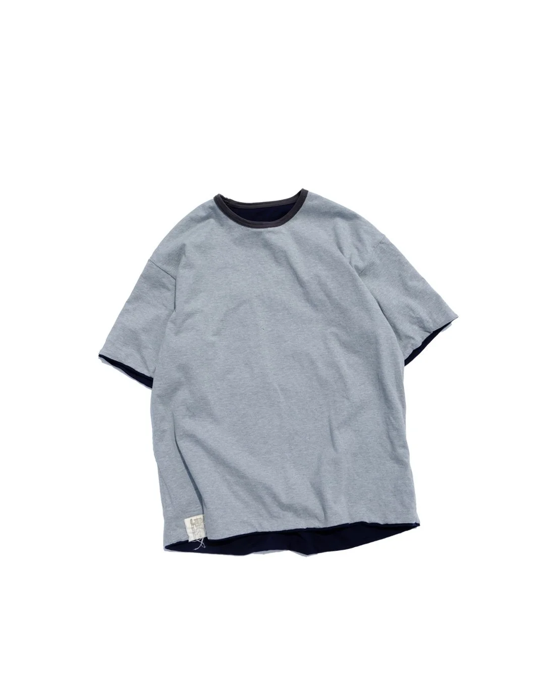 アメリカの古着のような、裏表で色が違うダブルフェイスTシャツ。THE FABRICでも発足当初から販売している定番アイテム。今回は内側の色をすべて杢グレーにし、本来持つ素材のストーリー性を重視した色付けをしている。グレーは夏に着たくなる色ですが、汗ジミが目立ちやすいという欠点がある。しかし、このダブルフェイスTシャツなら裏表で色が違うため、汗ジミが目立ちにくいというメリットがある。生地はいつものオリジナルよりも少し薄めの30/1の糸を使った天竺素材で、首回りはバインダー仕様なので伸びにくくなっている。1枚で2度おいしい逸品。