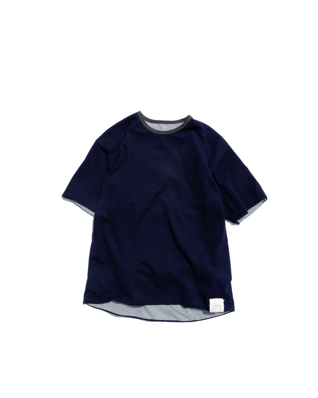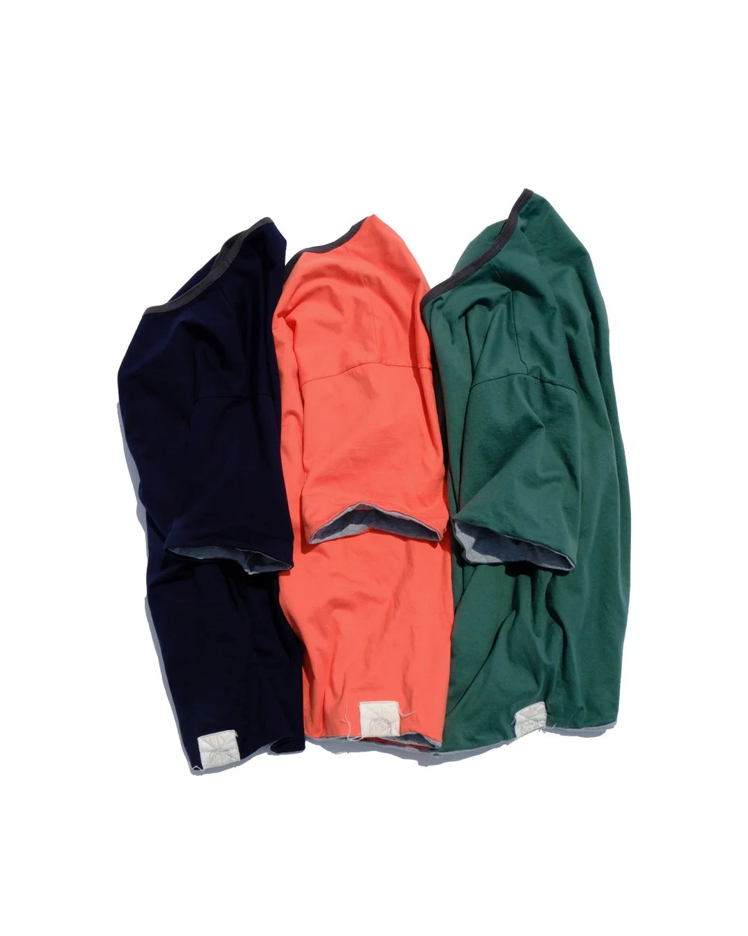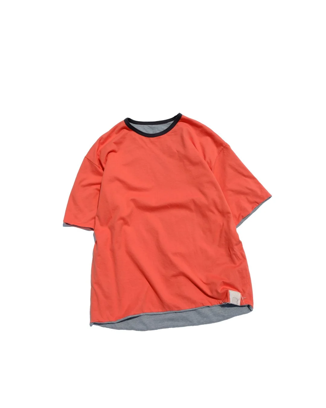 アメリカの古着のような、裏表で色が違うダブルフェイスTシャツ。THE FABRICでも発足当初から販売している定番アイテム。今回は内側の色をすべて杢グレーにし、本来持つ素材のストーリー性を重視した色付けをしている。グレーは夏に着たくなる色ですが、汗ジミが目立ちやすいという欠点がある。しかし、このダブルフェイスTシャツなら裏表で色が違うため、汗ジミが目立ちにくいというメリットがある。生地はいつものオリジナルよりも少し薄めの30/1の糸を使った天竺素材で、首回りはバインダー仕様なので伸びにくくなっている。1枚で2度おいしい逸品。