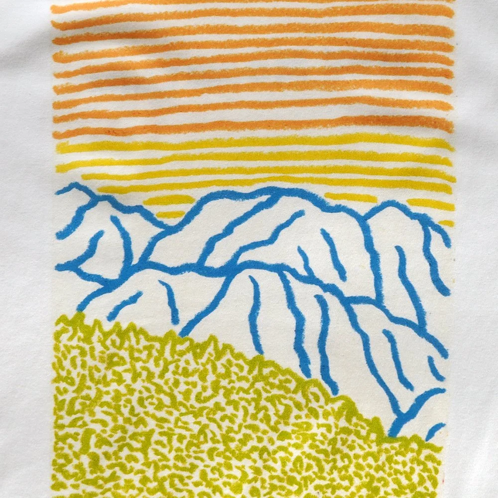 On the front, the bold and straightforward words “BLUE MOUNTAIN.” On the back, a powerful depiction of a mountain, drawn in rich strokes of crayon, expressing gratitude toward the mountains and hope for the future.This is more than just a T-shirt.